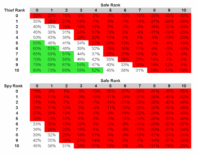 Spies hold their own against Thieves here thanks to the 2xPC factor in their formula. However, neither are likely to live through the lower ranks if their survival is dependent upon actually detecting traps. As can be seen below, the chances are quite low. It's interesting that the designers didn't include Trap rank as part of the formula as I would think a better quality trap - indicated by higher rank - would be harder to detect.Spy Detect Trap: ([2 x Perception] + [7 x Rank])